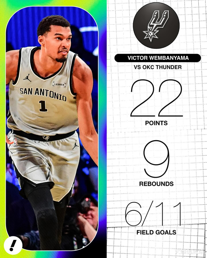 文班亚马在末节最后时刻统治了比赛,一人独得15分。虽说雷霆一度依靠一记三分球反超比分,可是文班亚马的进攻火力,还是帮助马刺领先4分,进入到末节最后一分钟。双方最后甚至采用我们久违的犯规战术,每秒必争,频繁上罚球线。可惜,最后杰伦威廉姆斯两罚一中,卡鲁索补篮不中,导致雷霆最后以3分的分差,输掉了比赛。